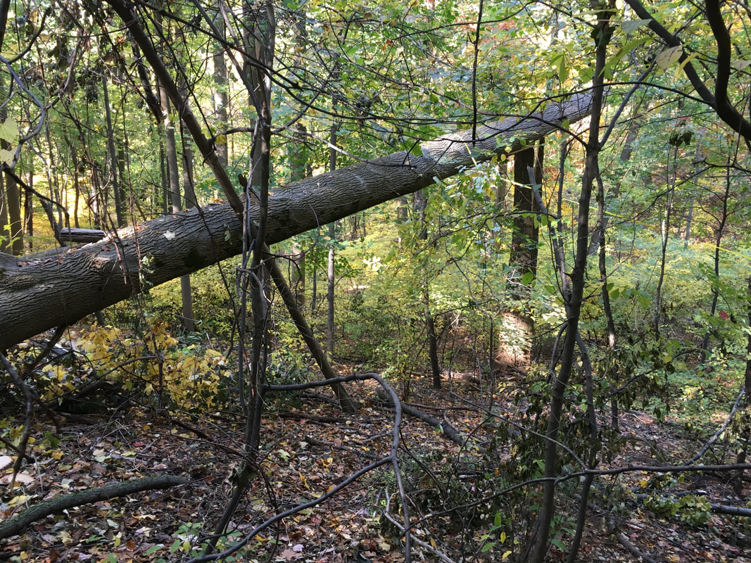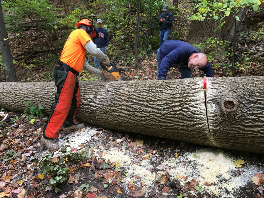 Removing a large and dangerous fallen oak in McCoord Woods. The butt was hung on a splinter about 15 feet above the trail.